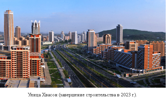 В Пхеньяне – столице Кореи – построены великолепные новые улицы, такие, как улицы Сонхва, Хвасон, «Римхын» и «Чонви», а район Комдока, являющийся базой по производству руд цветных металлов, обновляет свой облик как оригинальный город в горном ущелье.