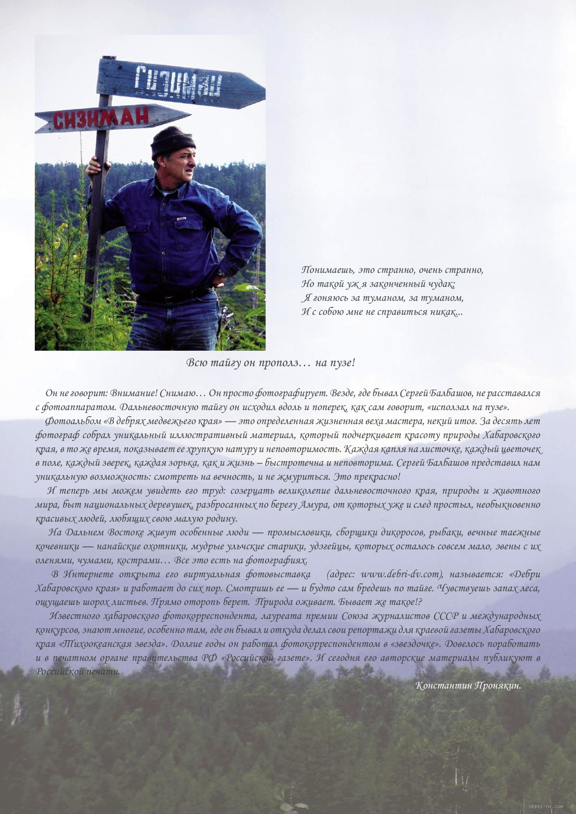 Интернет-выставки на портале «Дебри-ДВ». Пока только там мы можем глазами фотохудожника созерцать все великолепие дальневосточного края, природы и животного мира, быт национальных деревушек, разбросанных по берегу Амура, от которых уже и след простыл, необыкновенно красивых людей, любящих свою малую родину...