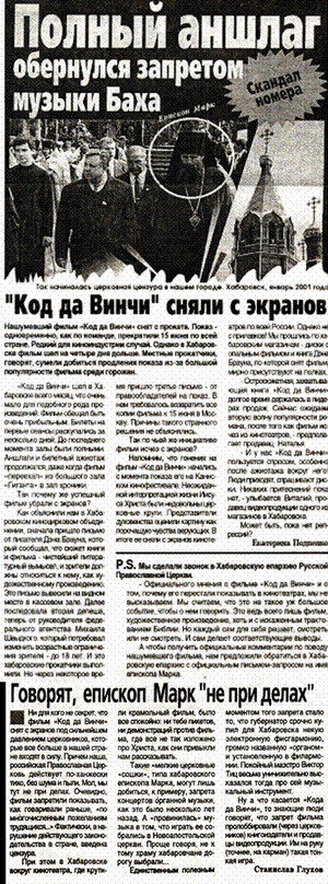 Напомним, что гонения на фильм «Код да Винчи» начались с момента показа его на Каннском кинофестивале. Неожиданной интерпретацией жизни Иисусу Христа были недовольные церковные круги. Представители духовенства оценили картину как порочащую чувства верующих. В итоге ее сняли с экранов кинотеатров по всей России. Однако не с прилавков! Мы прошли по хабаровским магазинам - диски с опальным фильмом и книга Дэна Брауна, по которой снят фильм, мирно присутствуют на полках.