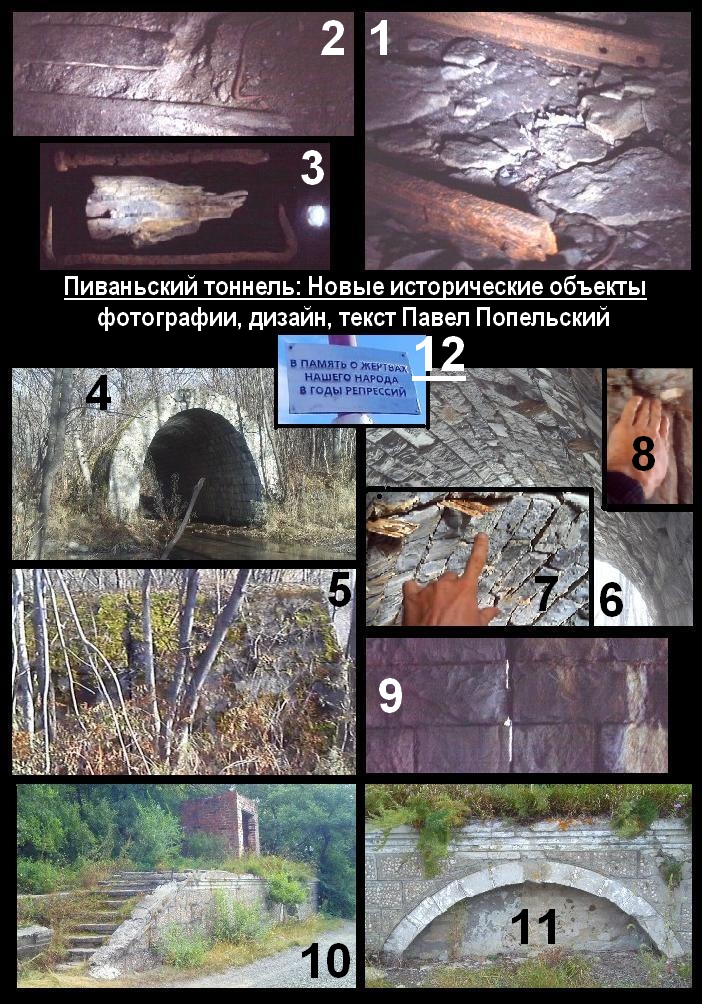 1. Исторические артефакты внутри Пиваньского тоннеля. Эти три фотографии я сделал летом 2016, когда Пиваньский тоннель не был полузасыпан щебнем, и туристы, учёные, местная молодежь спокойно проходили в него из оврага - железнодорожного портала. Фото 1 - Пройдя первую низкую пробку, все видели ржавые старые рельсы конца тридцатых годов, тянущиеся посреди тоннеля. Фото 2 - Дальше этих рельсов ко второй высокой пробке и аварийному завалу на мокром полу тоннеля лежали полусгнившие шпалы от рельсов и скобы к ним. Фото 3 - Для этой уникальной фотографии я положил на каменный пол тоннеля кусок шпалы посредине, ржавую скобу и такой же ржавый рельсовый костыль, подсветив видным рядом фонариком. Всё это относится к эпохе строительства тоннеля, 1939-1941. У меня резонный вопрос: почему в экспозициях музеев Комсомольска нет экспонатов или фотопанорам из Пиваньского тоннеля, нет его трехмерных макетов, - ведь это дало бы яркое представление гостям об истории города, напротив речного вокзала которого сразу же расположена Пивань?!..