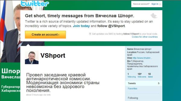 Губернатор Хабаровского края Вячеслав Шпорт 5 июля завел аккаунт во всемирно известном интернет-сервисе микроблогов Twitter. Теперь все пользователи сети Интернет могут читать короткие сообщения от Губернатора в его микроблоге www.twitter.com/VShport.