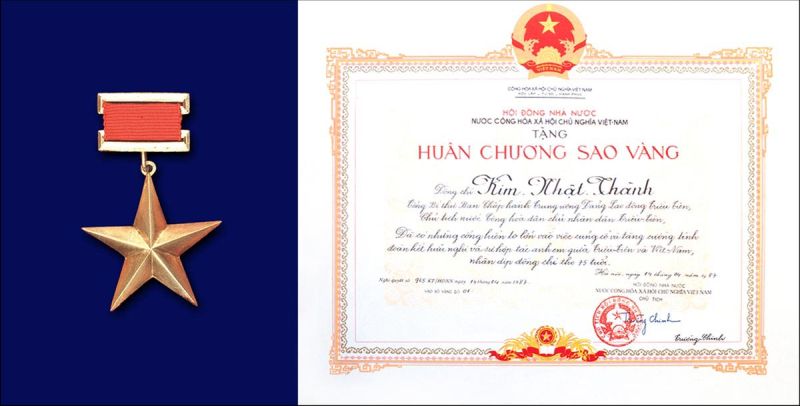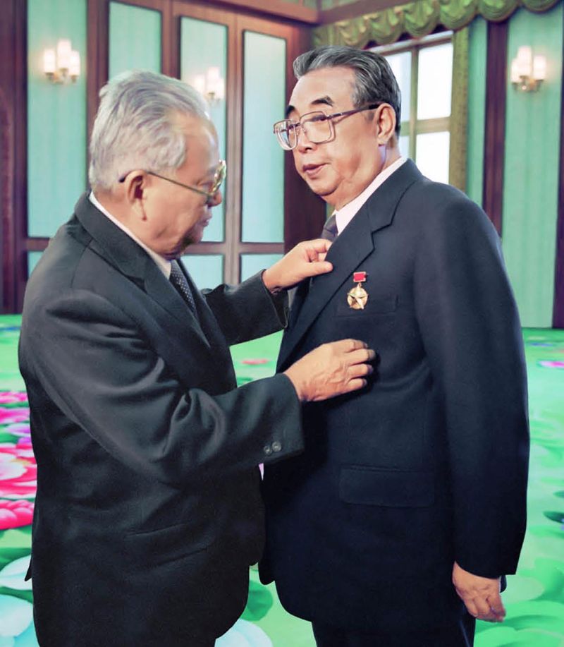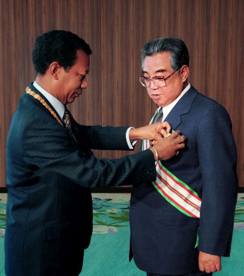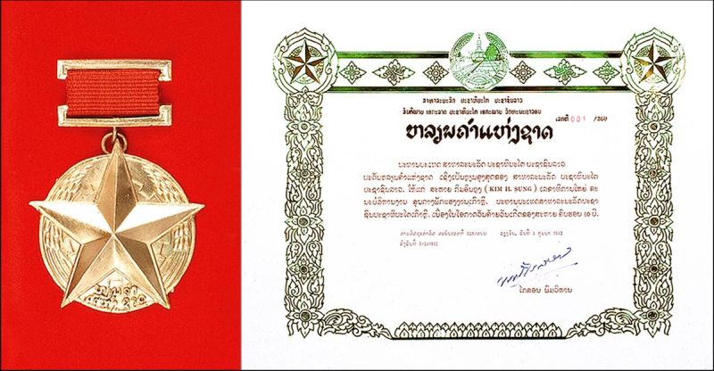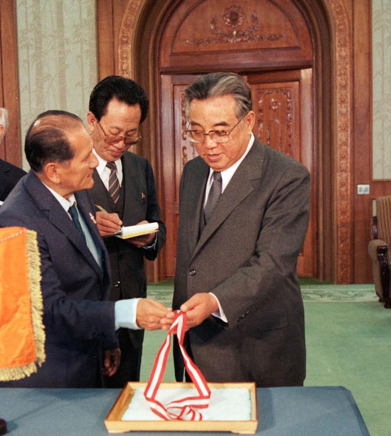 Президент ЛНДР Кейсон Фомвихан награждает Ким Ир Сена медалью. Апрель 1992 г.