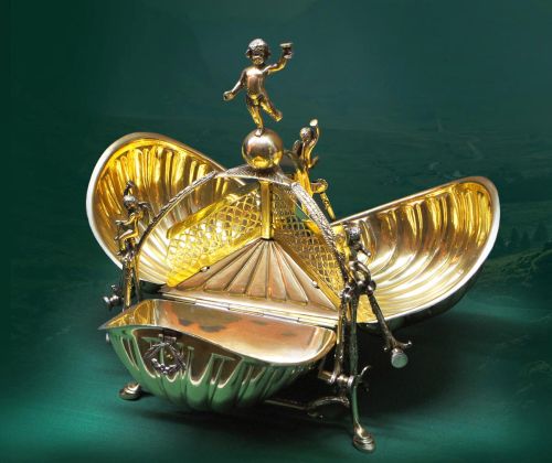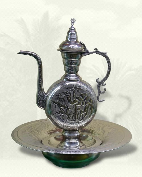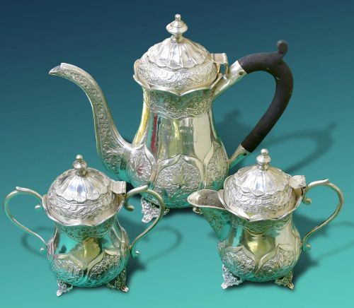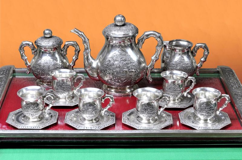 Ручные часы, серебряные сахарница, чайник и заварочный чайник.