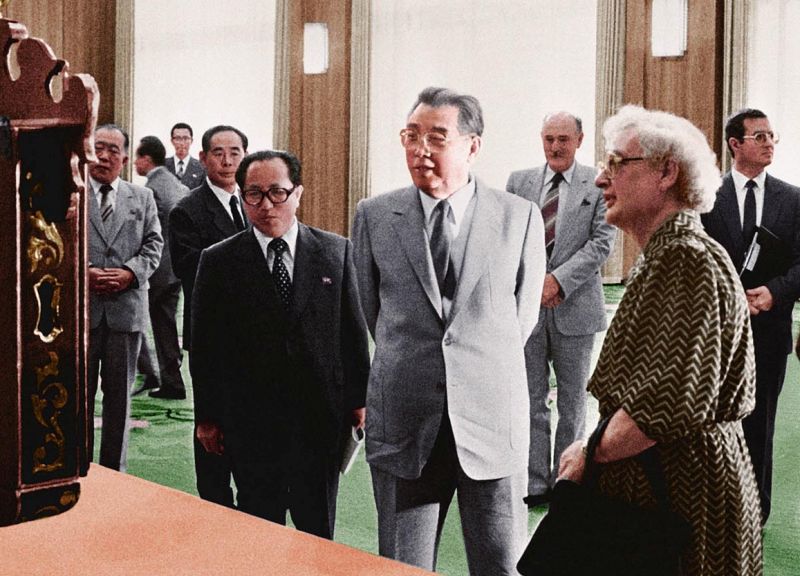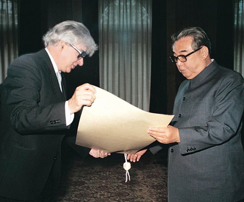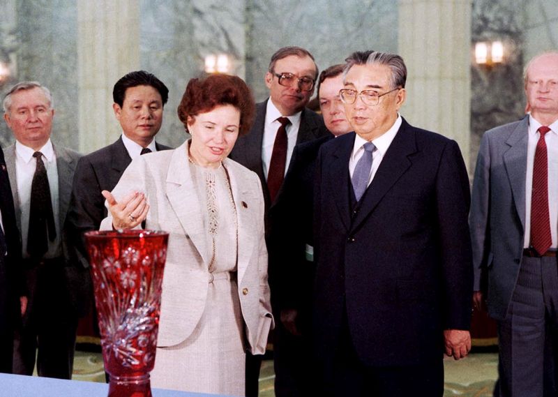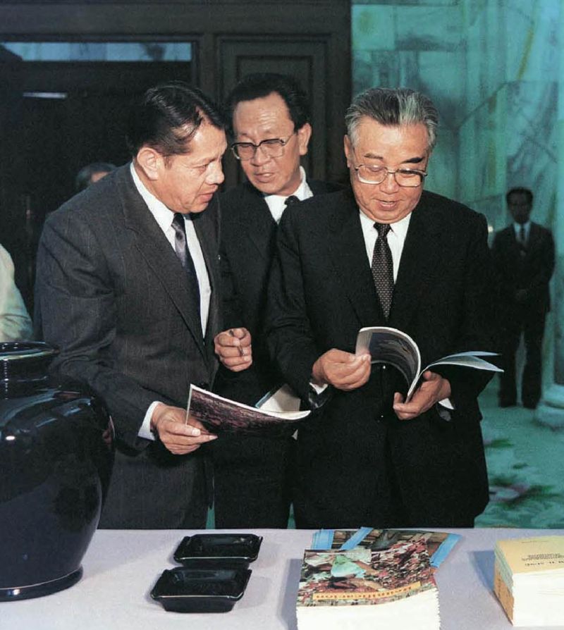 Председатель КНР Ли Сяньнянь ознакомляет Ким Ир Сена с подарком. Октябрь 1986 г.