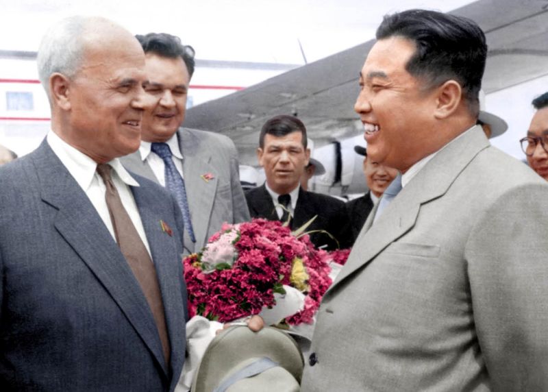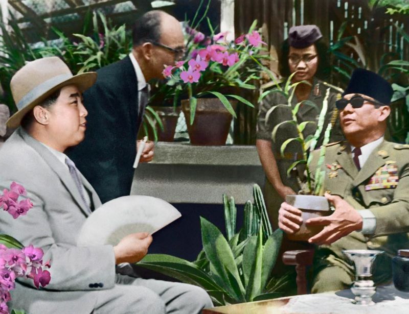 Президент Республики Индонезия Сукарно преподносит Ким Ир Сену цветок кимирсенхва. Апрель 1965 г.