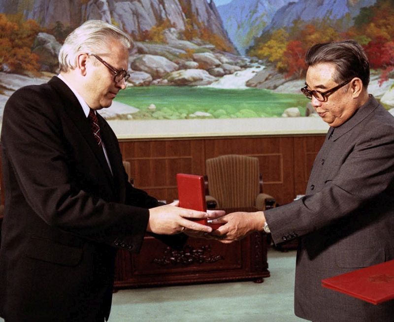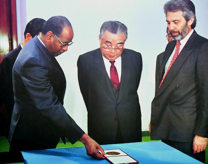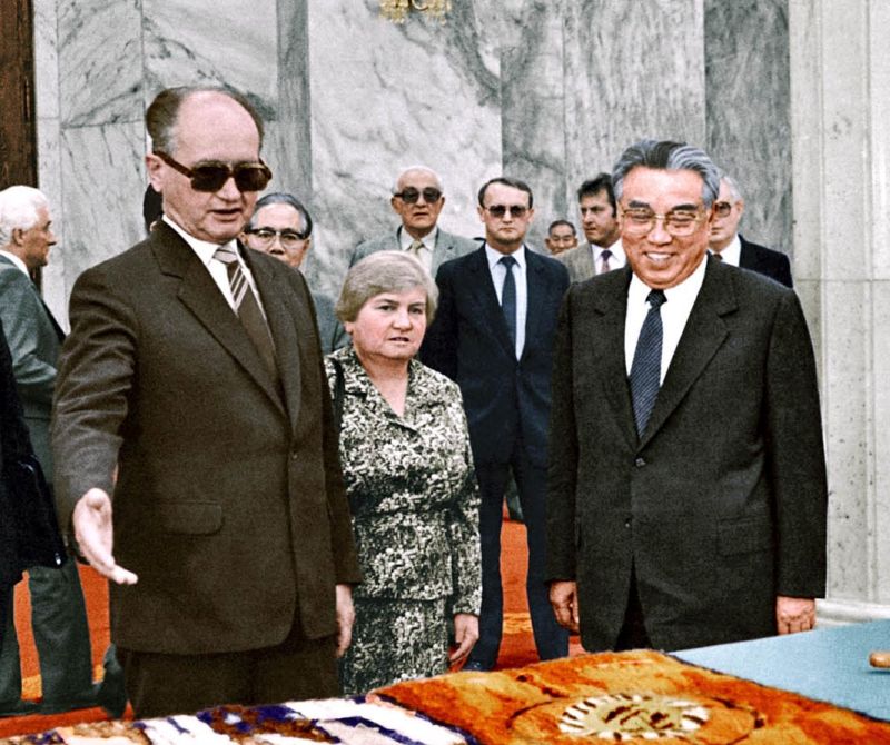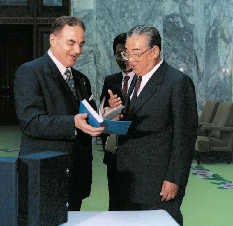 Ким Ир Сен ознакомляется с подарком от Межпарламентского союза. Апрель 1991 г.