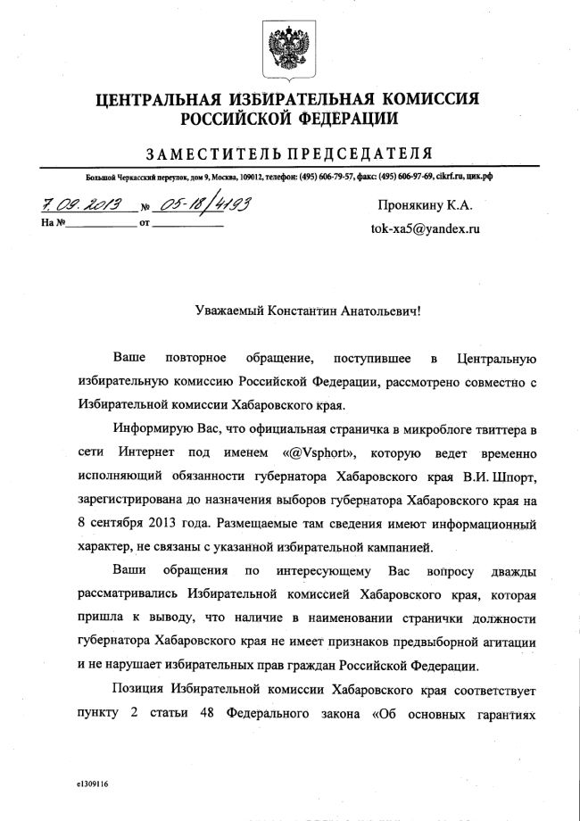 На наши доводы зампред ЦИКа Леонид Ивлев заявил, что страничка в твиттере «@Vsphort» зарегистрирована до назначения выборов губернатора Хабаровского края на 8 сентября 2013 года. И размещаемые там сведения имеют информационный характер, не связаны с указанной избирательной кампанией.