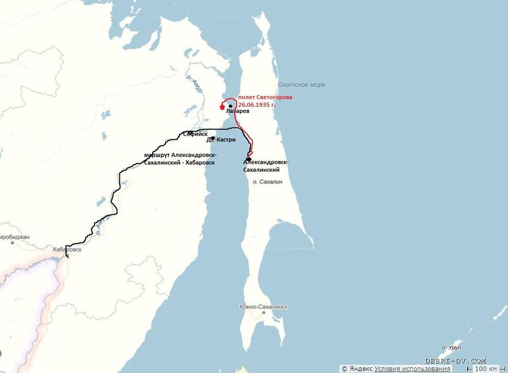 Маршрут гидросамолета лежал от Александровск-Сахалинского через Татарский пролив с заходом на материк (ворота материка) в районе оз. Большие Кизи, и далее, оставляя слева п. Де-Кастри, поворачивая курсом к п. Софийск, выйти на Амур. И по реке, как по путеводной нити, в Хабаровск, по правой стороне.