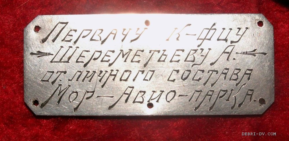 | Именная табличка «Первачу к-[расно]ф[лот]цу Шереметьеву А. от личного состава Мор-авиа-парка» |