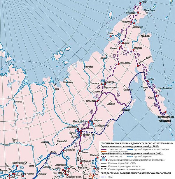 Предлагались два варианта прокладки трассы до Магадана: северный (этот вариант заложен в стратегии РЖД) и южный.