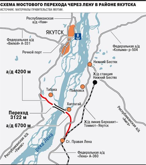 В письме от 8 ноября господин Николаев сообщает, что власти республики провели переговоры «с потенциальными инвесторами о реализации проекта Ленского моста в районе Якутска на основе частной концессионной инициативы». Определена трассировка мостового перехода - 3,1 км моста и 10,9 км подходов.