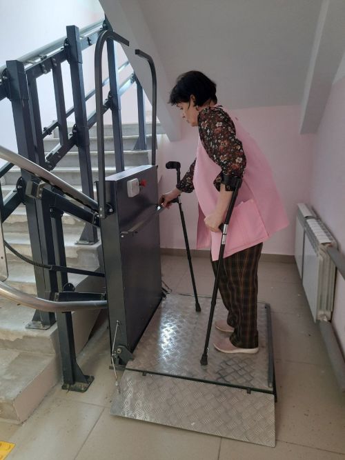 Это единственные в нашем районе дома, где установлены подъемные платформы для маломобильных граждан. Как известно, все колясочники мечтают, чтобы в их домах были подъёмники. С помощью них человек на инвалидной коляске или на костылях может без проблем подняться до нужного этажа или спуститься. Крыльцо тоже не является препятствием – возле него устанавливается специальная подъемная платформа.