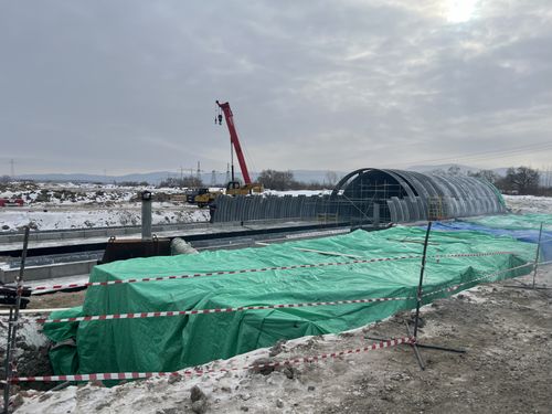 В настоящее время активные работы ведутся сразу на нескольких участках трассы, в том числе в местах возведения мостовых переходов. Продолжается погружение свай, устройство железобетонных ростверков и монтаж арочных мостовых конструкций.