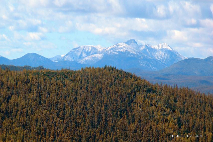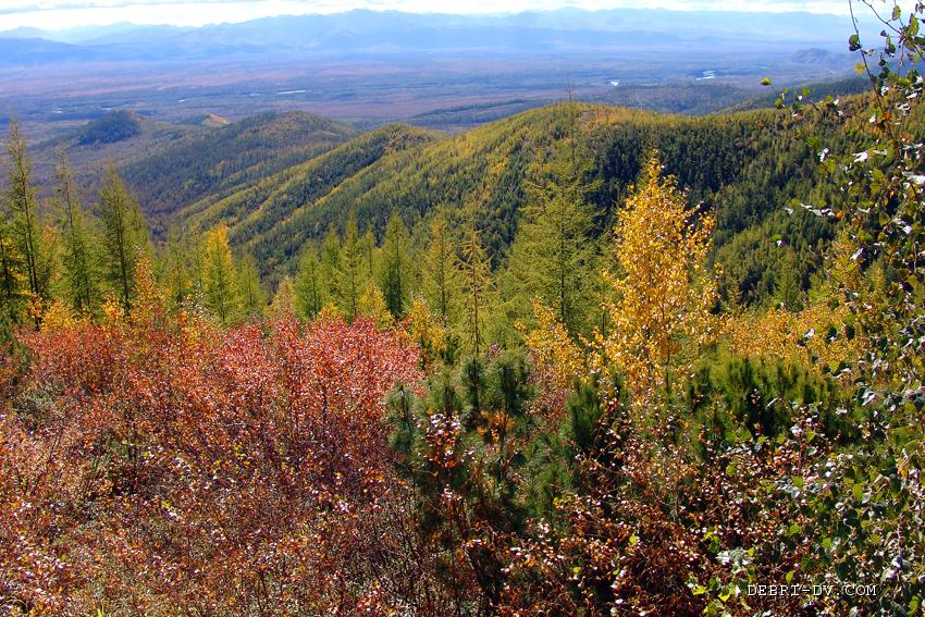 С перевала открылась волшебная картина, кругом залесенные горы, слева далеко внизу в дрожащей синеватой дымке блестит под солнцем красавица Амгунь, справа суровая таежная Темга. Ночью в горах выпал первый снег.