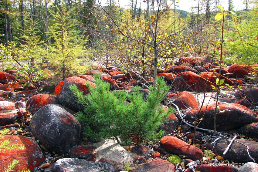 Фотоочерк Сергея Балбашова: Чем выше мы поднимались, тем чаще встречались красные валуны, они словно яблоки всюду разбросаны по берегам, сквозь них пророс желтеющий зеленый мох, очень красиво. Красные камни имеют тонкий запах роз