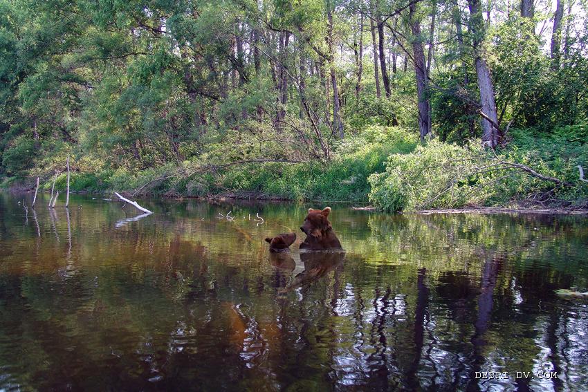 ...За поворотом чуть не столкнулись нос к носу с медведем. Притаились. Из-за шума реки, он не услышал нас. Зверю уже оставалось сделать до нас каких-нибудь пятнадцать шагов. И тут он внезапно остановился. Возможно, впервые почуяв незнакомый запах, испугался и угрожающе зарычал.