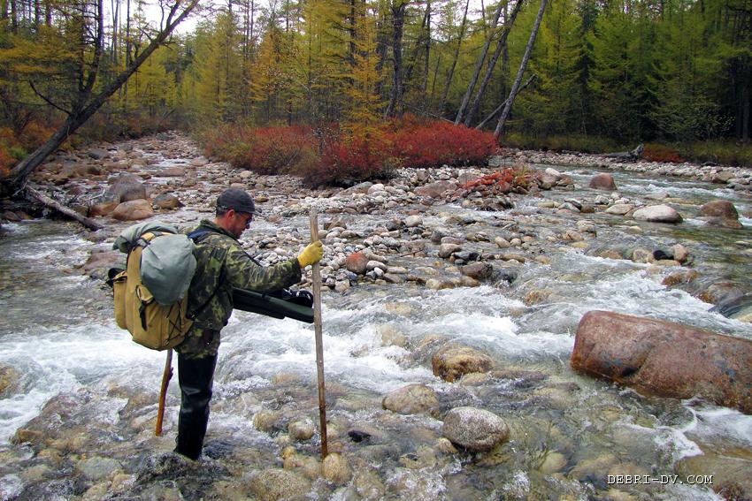 Река шумливая протекает через горные массивы. Дно реки каменистое, тропу о которой нам проведал начальник мы не нашли поэтому весь путь пролегал по самому руслу реки. Это было что-то. Немногие могут оценить наше путешествие с точки зрения экстремальности. Представьте себе три молодых, правда, пенсионера с объемными рюкзаками, штурмуют речные перекаты, скачут по камням словно снежные бараны. Чем выше мы поднимались, тем больше становились каменные преграды. Перепад реки виден невооруженным глазом, в омутах вода изумрудного цвета. Наш добытчик и проводник Александр Малых поймал с десяток довольно больших хариусов. Решили их быстренько поджарить и съесть. Поэтому решили стать на ночевку и сделать это на коренном берегу.