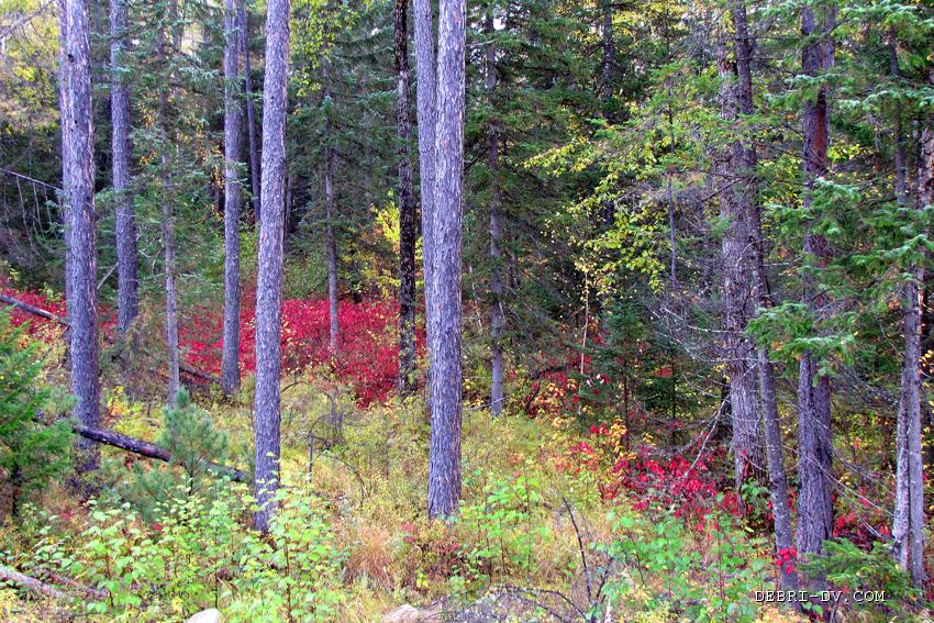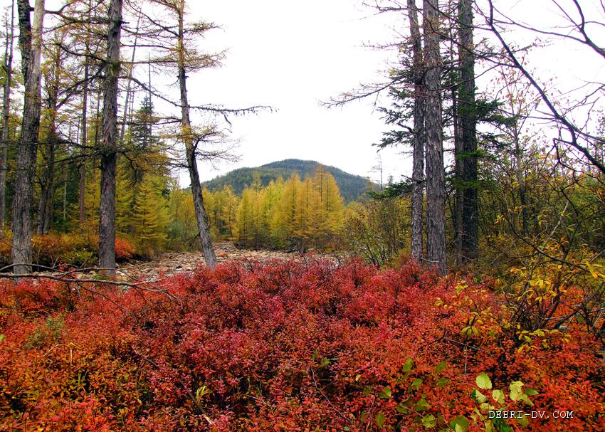 Прошло всего три дня с момента нашего путешествия, совершенно фантастический цвет приобрели лиственничники и ельники-зеленомошники во влажных местах. Длинные седые бороды лишайников прихотливо украшали их стволы и ветви. Вдоль русла реки тянулись расцвеченные желтыми и красно-желтыми красками лиственничные деревья: береза, ольха и рябина.
