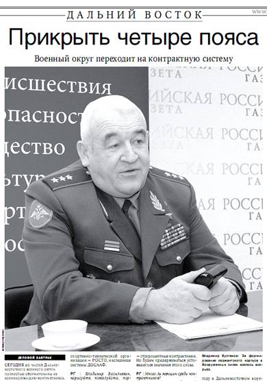 Булгаков | Выполнение программ по переводу соединений и частей на контрактный способ комплектования в округе завершено, 20 дальневосточных частей состоят полностью из контрактников, это мотострелковые и артиллерийские части. Вообще-то я считаю, что деление офицерского состава армии на контрактников и неконтрактников неверно, ведь все молодые офицеры, заканчивая военные учебные заведения, подписывают свой первый контракт сроком на пять лет, так что все офицеры — стопроцентные контрактники. Но будем придерживаться устоявшегося значения этого слова.