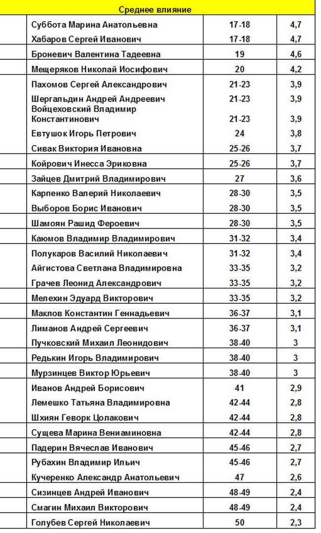 В группе политиков со средним влиянием они ранжируются по принципу бюрократической иерархии, основанной на значимости направлений региональной политики или политического веса муниципального образования. Исключая членов оппозиционных партий, это представители региональной политической элиты, обеспечивающие деятельность губернатора Камчатского края. Наименьшее влияние среди представителей политической элиты края имеют депутаты ЗСКК от КПРФ и ЛДПР.