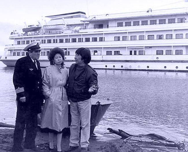 | Ольга Бельды с мужем Кола Бельды у теплохода 30 лет ГДР с капитаном В.П.Панюшевым. 1990 г. Амур. |