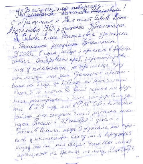 «Я, Елена Анатольевна Сивова, уроженка г. Ташкента Республики Узбекистан, в 2009 году приехала в п. Заветы Ильича Советско-Гаванского района, зарегистрировалась у племянницы. Через 3 месяца мне дали временное проживание на три года. По окончании срока я не смогла вовремя подать на продление регистрации и была за это оштрафована.