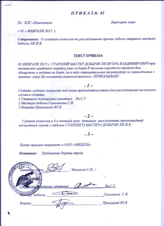Также Владимир Ли подтвердил, что «Сергей Ли по судовым документам числился старпомом, а фактически исполнял обязанности капитана С.Н. Васильева».