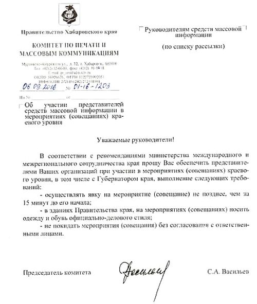 | Рекомендация журналистам, коряво составленная перед сентябрьскими выборами главой краевого комитета по печати Сергеем Васильевым |