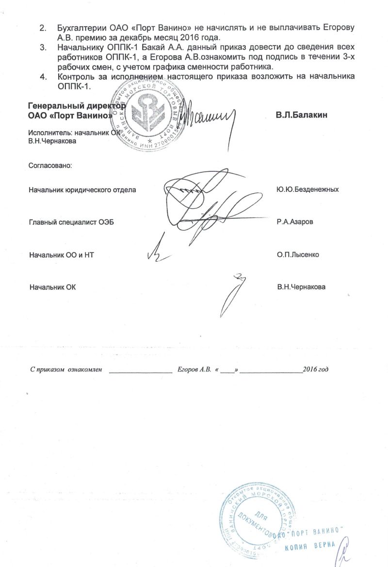 «Учитывая обстоятельства, при которых был совершен проступок, в соответствии со статьями 192, 193 Трудового кодекса РФ приказываю: механизатору (докеру-механизатору) Егорову А.В. за нарушение Правил внутреннего трудового распорядка пункта 4.2 и Инструкции по охране труда для механизаторов (докеров-механизаторов) №1 пунктов 1.6.(6) и 1.7 - объявить выговор. Бухгалтерии ОАО «Порт Ванино» не начислять и не выплачивать Егорову А.В. премию за декабрь 2016 года».
