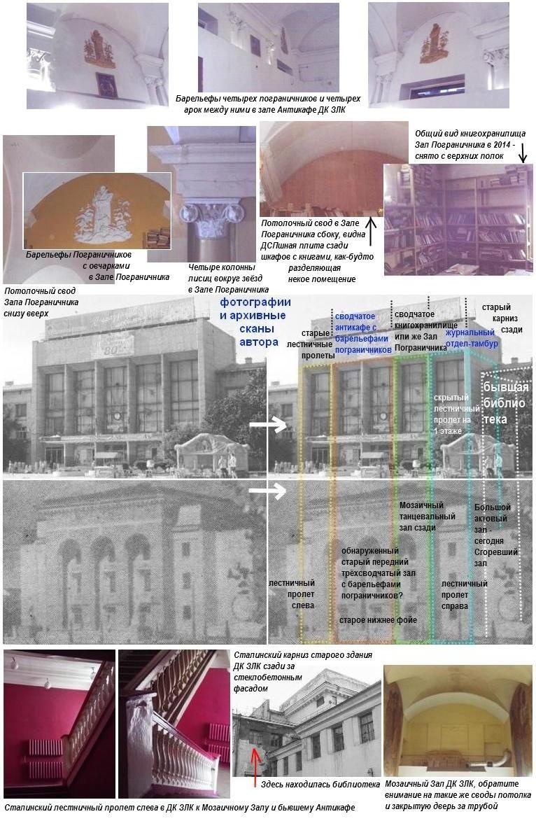Смотрите на иллюстрацию выше. Пять вертикальных делений современного фасада с окнами соответствуют пяти вертикальным делениям фасада с окнами сталинского. Западное первое деление - желтое - сохранившиеся старые лестничные пролеты к Мозаичному Залу и Антикафе - западные окна сталинского дворца. Два западных деления - красные - Зал Четырех Пограничников Антикафе- центральные западные окна сталинского дворца. Восточное зеленое деление - Зал Пограничника книгохранилища - восточное центральное окно сталинского дворца. Восточное синее деление - тамбур бывшего журнального отдела, - восточное окно сталинского дворца, соответствующее окнам лестничного пролета западного. А это значит, что журнальный тамбур перед бывшим книгохранилищем - забитый сверху половыми досками...лестничный пролет, который до сих пор ведет снизу в восточном крыле! То есть сталинский старый дворец цел весь!