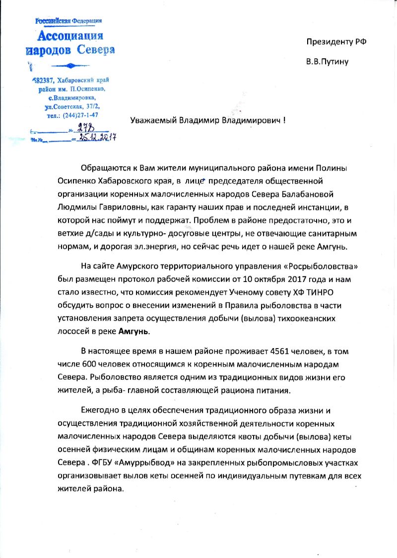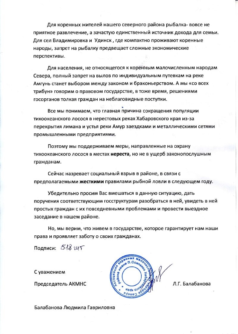 В сложившейся обстановке, при поддержке представителей ассоциации коренных народов севера в районе имени Полины Осипенко и по инициативе руководителя ее районного отделения Балабановой Людмилы Гавриловны жители выразили в письме* свою озабоченность и надежду, что только вмешательство со стороны президента страны гарантирует позитивные перемены в существующей негативной ситуации.
