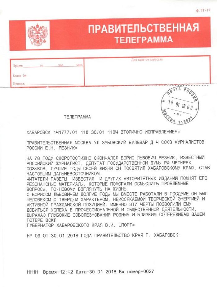 На 78-м году скоропостижно скончался Борис Львович Резник, известный российский журналист, депутат Государственной думы РФ четырех созывов. Лучшие годы своей жизни он посвятил Хабаровскому краю, став настоящим дальневосточником.