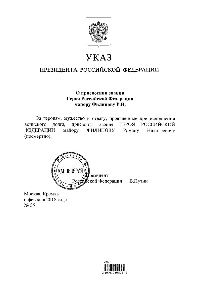 Текст Указа: «За героизм, мужество и отвагу, проявленные при исполнении воинского долга, присвоить звание Героя Российской Федерации майору Филипову Роману Николаевичу (посмертно)».