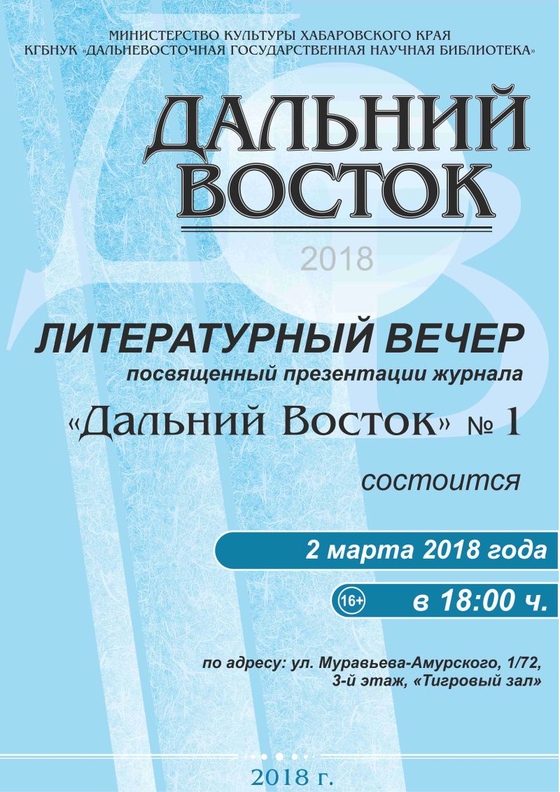 Литературный вечер состоится 2 марта (пятница) в Тигровом зале Дальневосточной государственной научной библиотеки, в 18.00. Вход свободный.