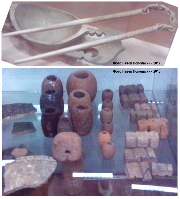 Нижнее фото: за год до этого, в сентябре 2016, я был в селе Джуен на берегу озера Болонь, со специальной большой коллективной этнографической и просветительской поездкой. Мне разрешили сфотографировать для цветного очерка в районной газете открытый в 2011 музей села. И среди многих экспонатов я обратил внимание на ряд разноцветных древних керамических сосудов разного размера, справа от которых лежали странные одинаковые артефакты, напоминающие керамическую черепицу или скорее всего... кирпичи. Расцветкой артефакты похожи на соседние керамические сосуды.