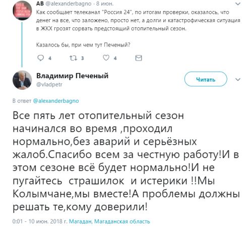 «Все пять лет отопительный сезон начинался во время, проходил нормально, без аварий и серьёзных жалоб. Спасибо всем за честную работу! И в этом сезоне всё будет нормально! И не пугайтесь страшилок и истерики! Мы Колымчане, мы вместе! А проблемы должны решать те, кому доверили!» - пишет экс-губернатор Владимир Печеный.