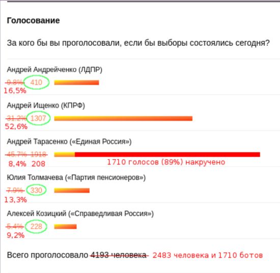 В первые часы опроса кандидаты шли почти вровень, к вечеру первого дня вперед вырвался коммунист Андрей Ищенко. Андрей Тарасенко показывал последний результат. Но затем простое интернет-голосование было воспринято кем-то слишком серьезно.