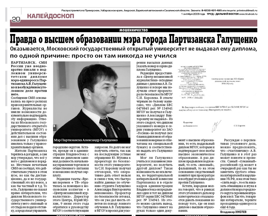 СМИ России уже неоднократно писали о подложном университетском дипломе мэра-единоросса Партизанска А.М. Галущенко и возбуждённом уголовном деле против него.