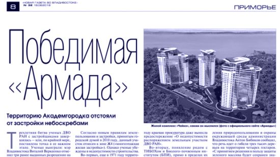 Вопрос об «Армаде» в очередной раз обсуждался на заседании президиума ДВО РАН 11 декабря. Главный ученый секретарь ДВО РАН член-корреспондент Виктор Богатов заявил, что санитарная зона вокруг ТИБОХа должна составлять не менее 150 метров. «Зона до сих пор не оформлена, чем и воспользовались. Но это не значит, что в случае ЧС не могут возникнуть проблемы с людьми, которые будут жить в многоэтажках. И самое главное, это сводит перспективы развития института к нулю», - считает Богатов.