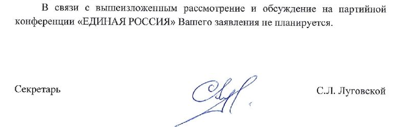 В связи с вышеизложенным рассмотрение и обсуждение на партийной конференции «Единая Россия» Вашего заявления не планируется.