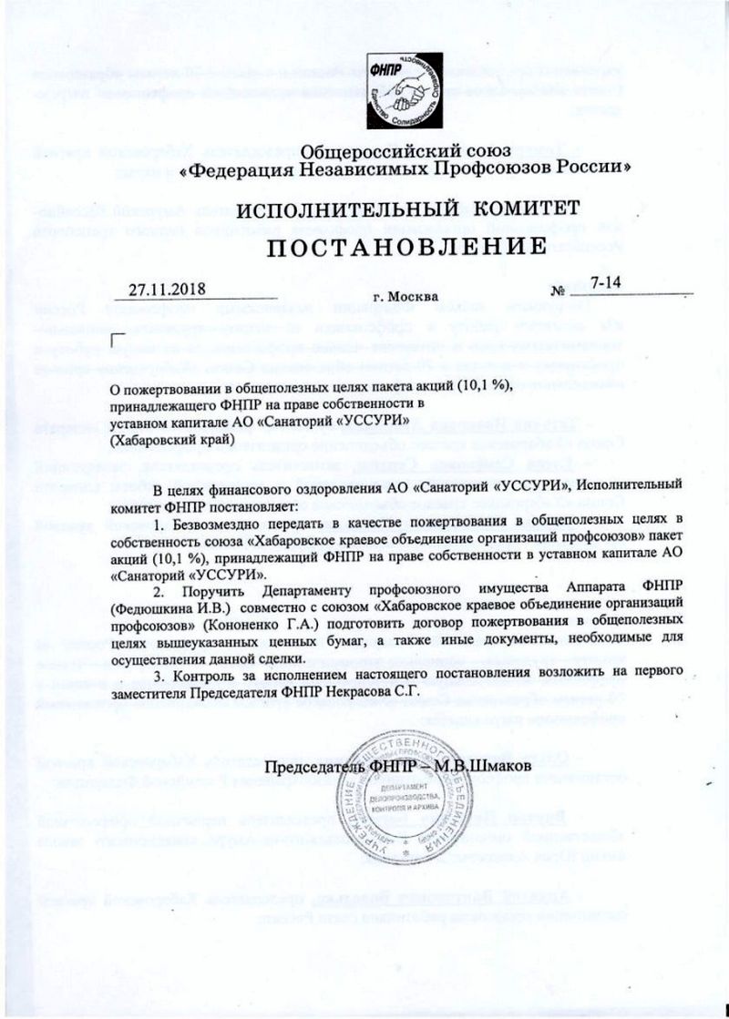 Исполнительный комитет ФНПР 27 ноября 2018 года издал постановление о пожертвовании в общеполезных целях пакета акций в количестве 503 обыкновенных именных бездокументарных акций (10,1 %) номинальной стоимостью 16 рублей каждая, принадлежащих ФНПР на праве собственности в уставном капитале АО «Санаторий «Уссури» (Хабаровский край). На основании договора пожертвования в общеполезных целях от 13 декабря 2018 года акции ФНПР были переданы профобъединению.