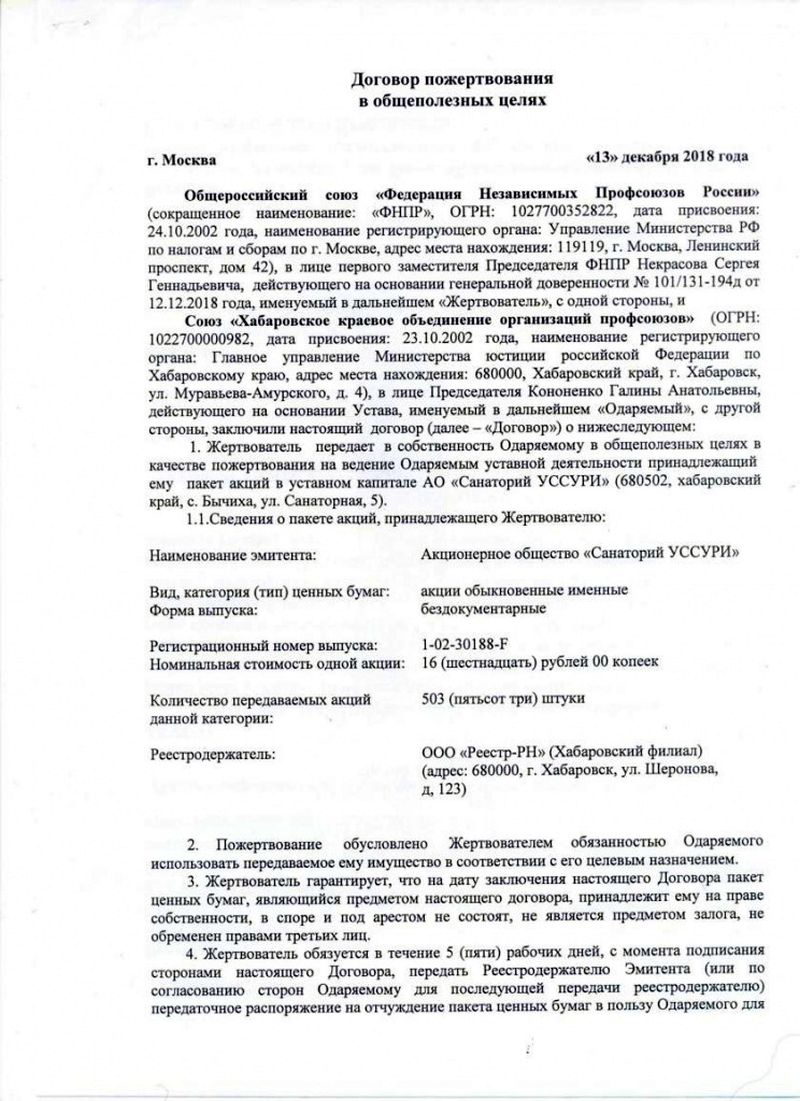Хабаровское профобъединение также из своих средств производит оплату процедуры юридического оформления сделки безвозмездной передачи в государственную собственность Хабаровского края акций АО «Санаторий «Уссури», жертвователями которых являются физические лица, большинство из них - бывшие работники санатория.