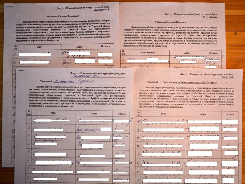 По инициативе членов общественного движения «Сила народа» в городе ПРОШЁЛ СБОР ПОДПИСЕЙ под коллективным обращением к депутатам городской Думы и лично Главе города А.В. Климову с требованием прекратить распродажу муниципального имущества. Это инициативу поддержали также общественные движения «Моя любовь Комсомольск», «Гражданский патруль», партии КПРФ и ЛДПР. Обращения переданы в городскую Думу и Главе города. Сбор подписей продолжается.