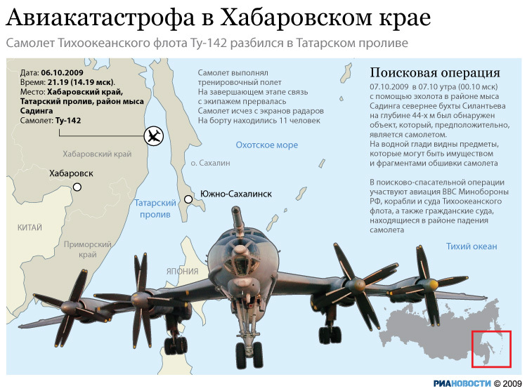 6 ноября 2009 года - самолет Минобороны РФ потерпел катастрофу в Хабаровском крае. Ту-142 Тихоокеанского флота упал в водную акваторию Татарского пролива. Место падения - в 15-20 километрах от береговой линии.
