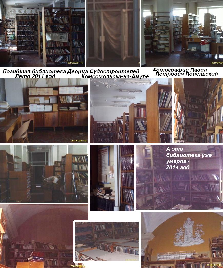 Когда библиотека ДК ЗЛК только что начала закрываться в 2008-2009 и её можно было сохранить как музей города, ветераны судостроительного завода дружно ОТКАЗАЛИСЬ от собственной библиотеки и не захотели оплачивать её ЖКХ. Никто в Комсомольске не захотел заниматься библиотекой, зато растаскивал её к 2013 весь интеллигентный Комсомольск!