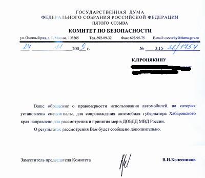 Ваше обращение о правомерности использования автомобилей, на которых установлены спецсигналы, для сопровождения автомобиля губернатора Хабаровского края направлено для рассмотрения и принятия мер в ДОБДД МВД России.