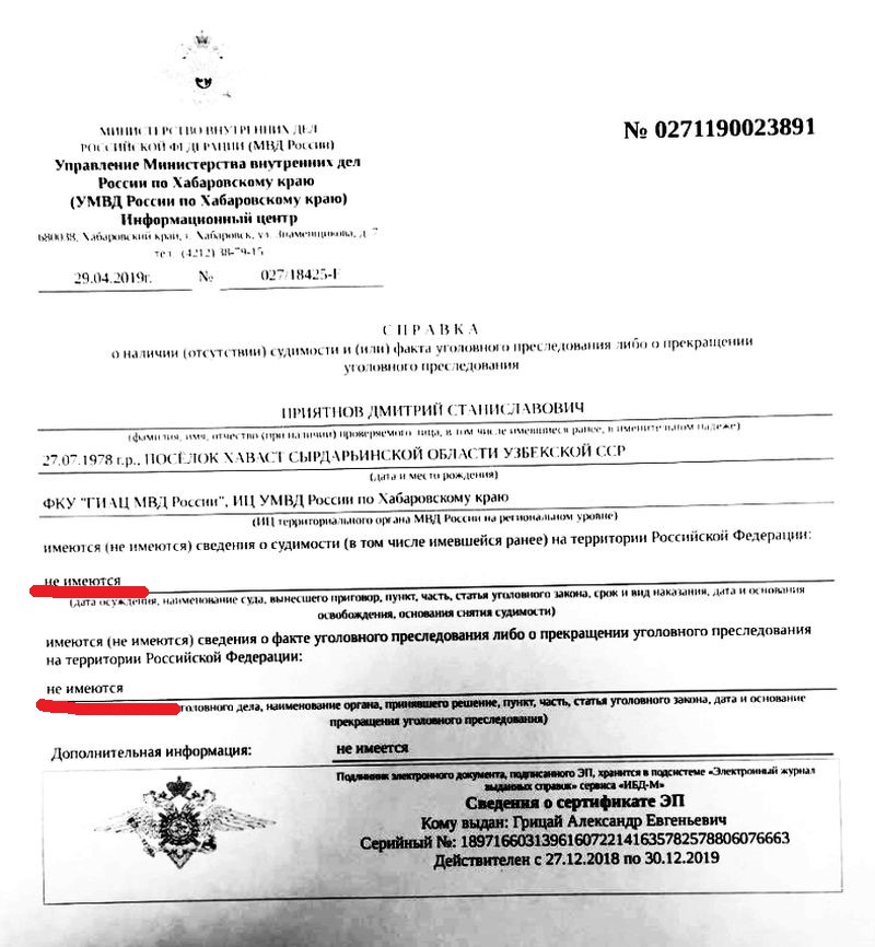 Ранее на сайте Хабаровского крайизбиркома было указано, что «Приятнов судим по статье 327 УК РФ «Подделка документов», судимость погашена в 2009 году».