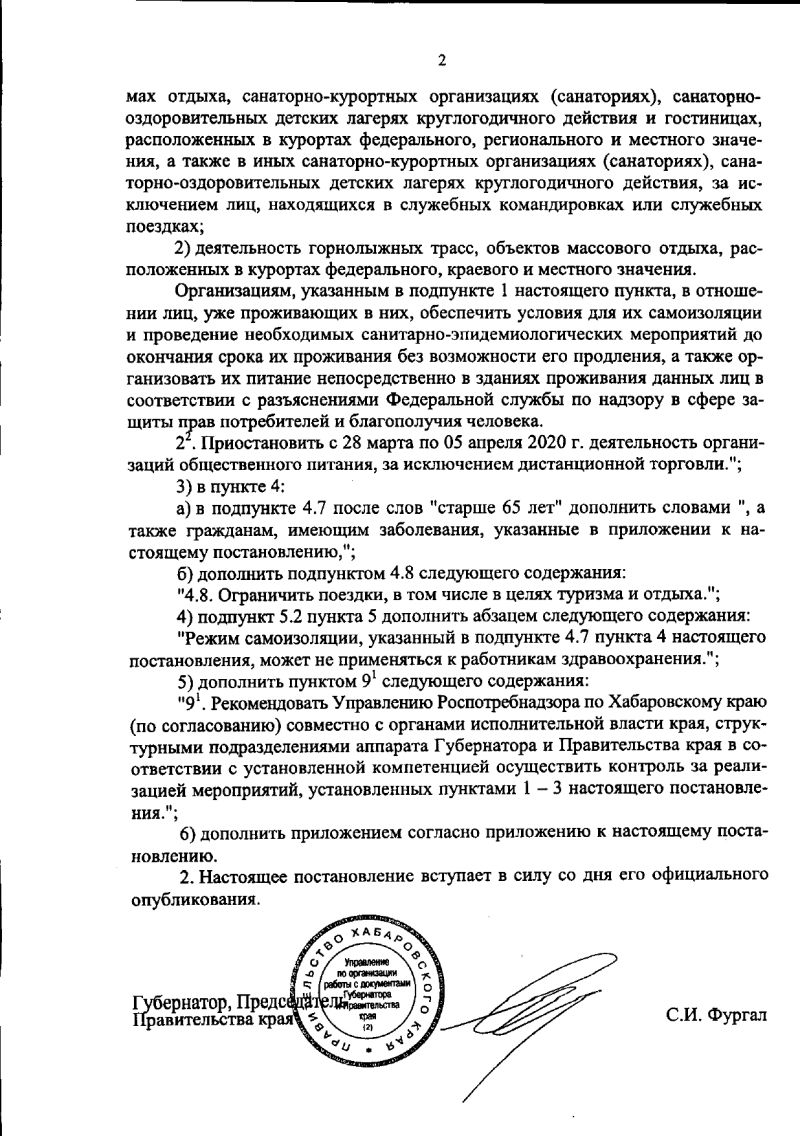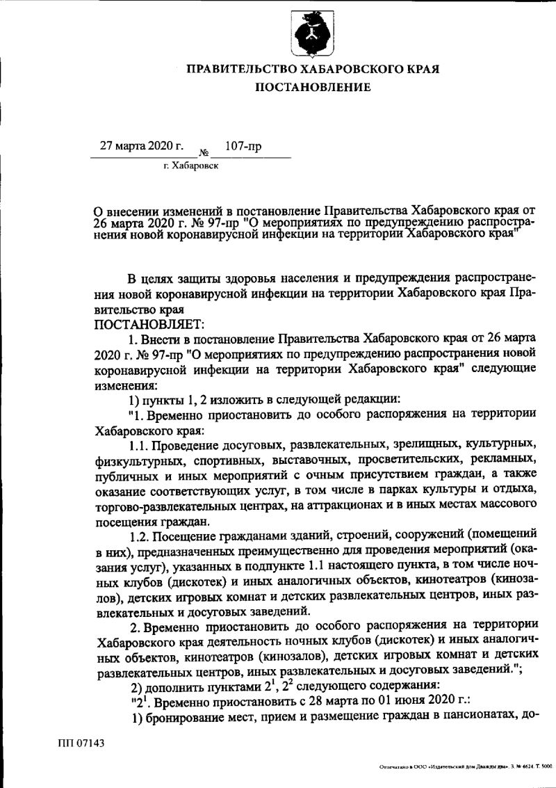 В целях защиты здоровья населения и предупреждения распространения новой коронавирусной инфекции на территории Хабаровского края губернатор подписал постановление временно приостановить до особого распоряжения на территории края проведение досуговых, развлекательных, зрелищных, культурных, физкультурных, спортивных, выставочных, просветительских, рекламных, публичных и иных мероприятий с очным присутствием граждан, в том числе в парках культуры и отдыха, торгово-развлекательных центрах, на аттракционах и в иных местах массового посещения граждан.