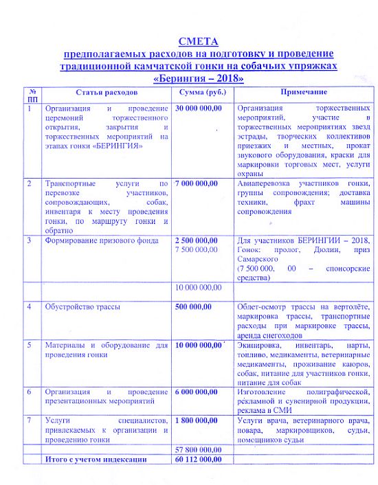 Так, например, в такой смете «предполагаемых расходов на подготовку и проведение традиционной камчатской гонки на собачьих упряжках «Берингия» в 2017 и 2018 году, представленных партнерством «Северные странствия», всего семь пунктов. Организация и проведение церемоний торжественного открытия и закрытия гонки - 27 млн рублей (2017 г.), 30 млн рублей (2018 г.); транспортные услуги - по 7 млн каждый год; формирование призового фонда - 8,04 млн и 10 млн, соответственно; обустройство трассы - по 500 тыс рублей каждый год; материалы и оборудование для проведения гонки - по 10 млн рублей каждый год; презентационные мероприятия (полиграфия, сувениры, реклама в СМИ) - 4 млн (2017 г.) и 6 млн (2018 г.); услуги врача, ветеринаров, повара, маркировщиков и судей - по 1,8 млн рублей ежегодно. И последняя строка - «итого». В 2017 году - 55,2 млн рублей, в 2018 - 60,1 млн рублей. И это только предполагаемые расходы.