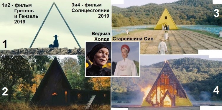 Как раз в последние годы в кино активно выдвигается на передний план героиня – женщина и соответственно женские взгляды. Посмотрите на эти фото еще раз и вспомните фильмы «Гретель и Гензель» и «Солнцестояние». Суть каждого из этих фильмов сводится к тревоге девушек за их пацанов из-за давящей злой воли зрелых женщин. В «Гретель и Гензель» это ставшая из-за такой же бывшей в миру несправедливости ведьмой и людоедкой Холда, в «Солнцестоянии» - спятившая от собственного тщеславия и ухода от суетного мира старейшина Сив. Таким образом, треугольник в этих фильмах – женский символ. В начале он возникает как бы каркасом для вовлечения чистых девчонок, а проходя через него, они вбирают абсолютное зло и перерождаются, либо спасая пацанов от зла, либо обрекая их на кошмар. Кстати, женская тема в 90-х годах превращала треугольник в букву Д и называлась она известным вам словом – Декаданс.